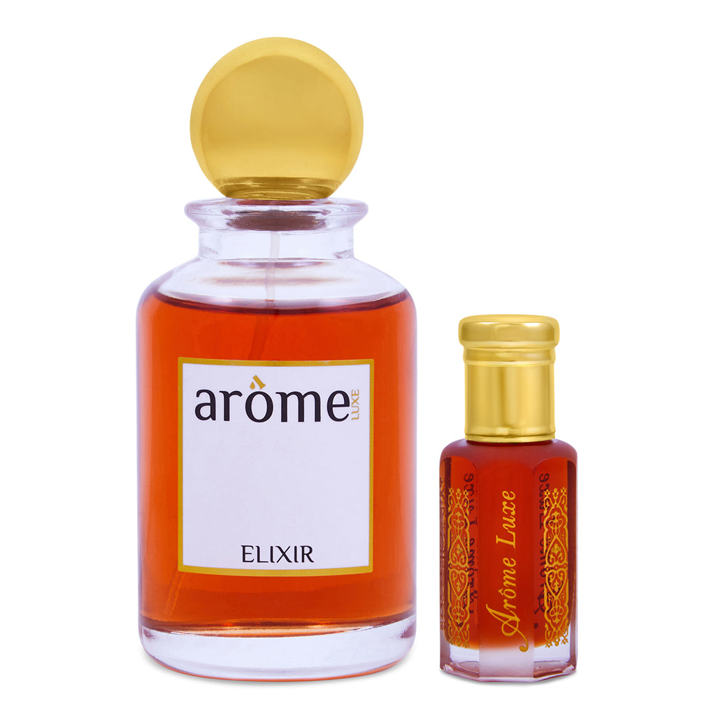 Experience the perfect balance of richness and radiance with our signature duo - featuring a 12ml perfume oil and a matching 50ml Elixir spray. The concentrated perfume oil delivers deep, long-lasting scent, while the Elixir spray enhances it with bold projection. Together, they create a layered fragrance experience that is both intense and unforgettable.